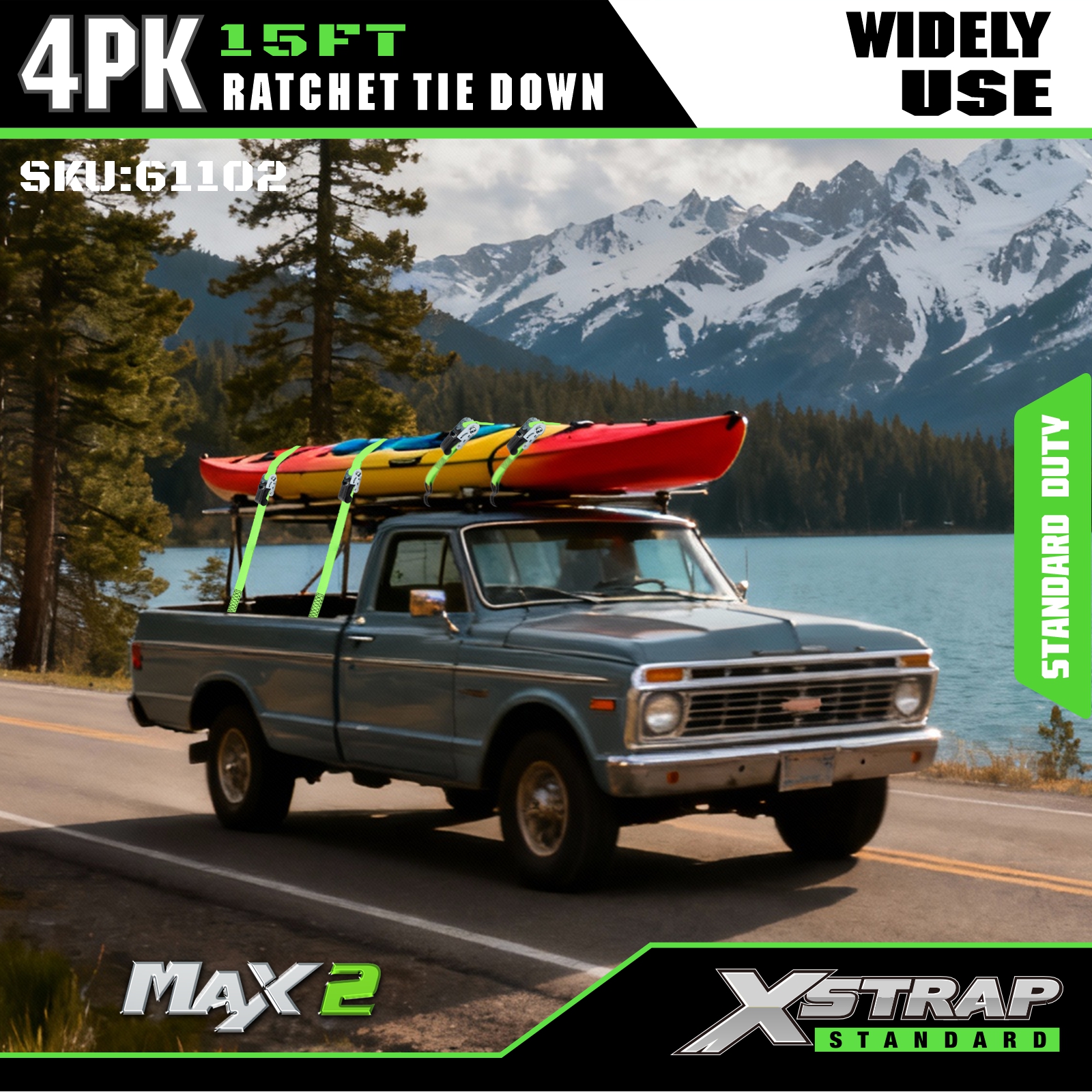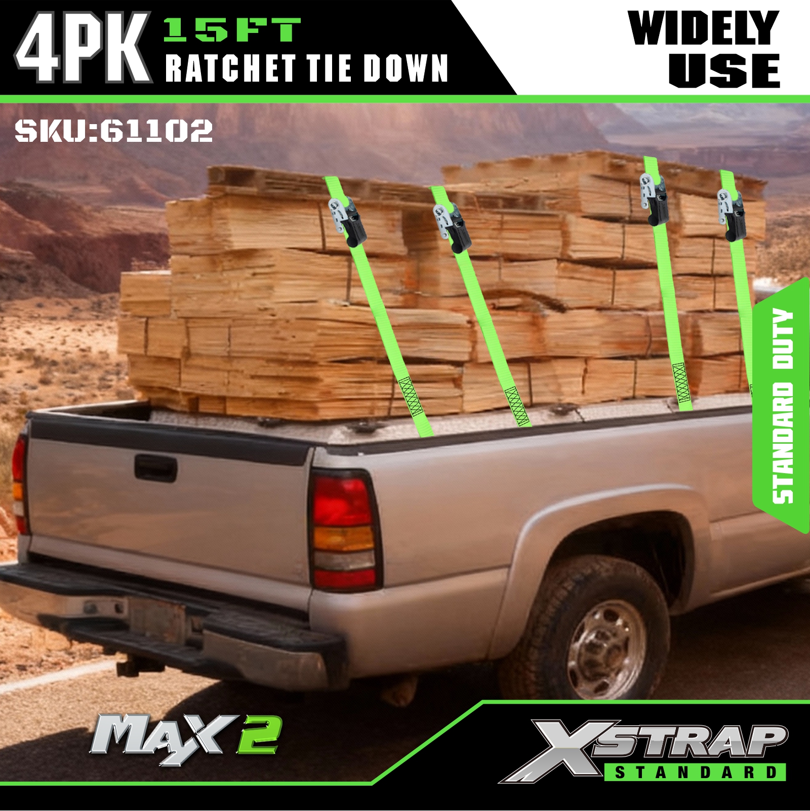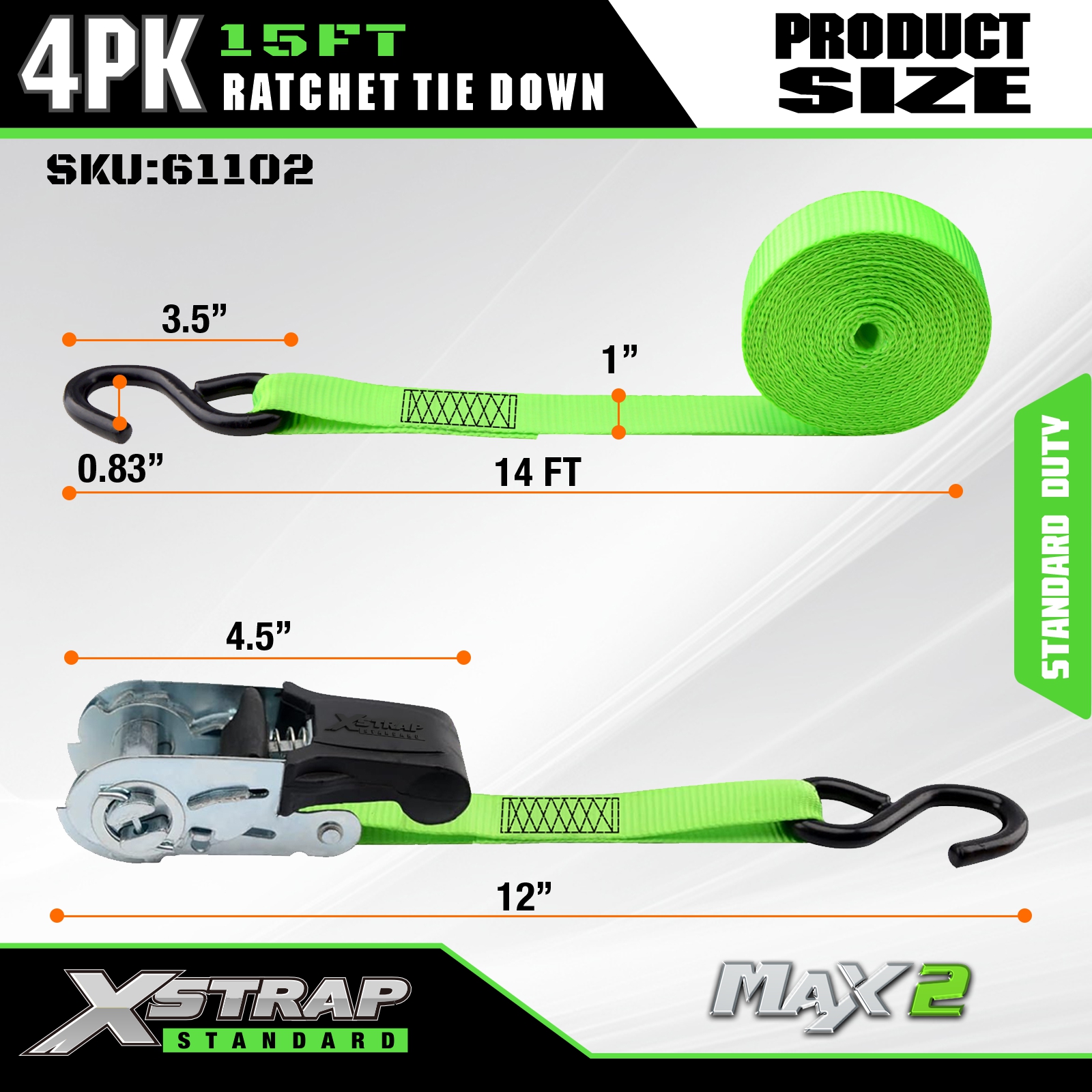 Correias de amarração de catraca Xstrap 4 PK 15 pés - 500 libras de capacidade de carga 1500 libras de resistência à ruptura - correias de carga para aparelhos móveis, equipamentos de gramado, motocicletas.