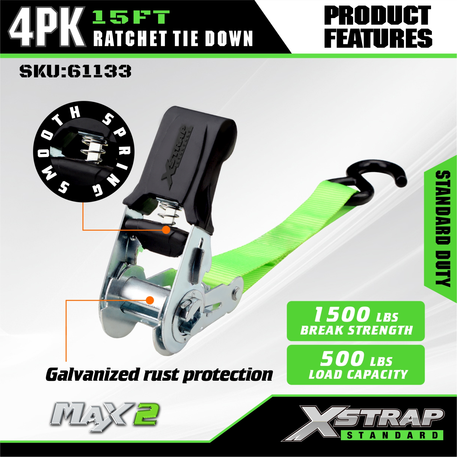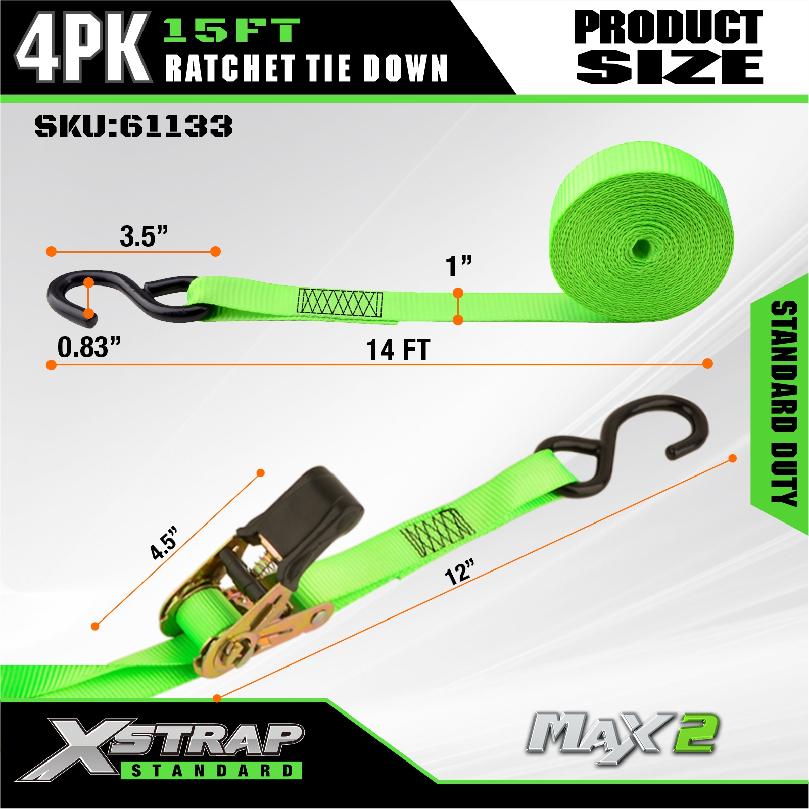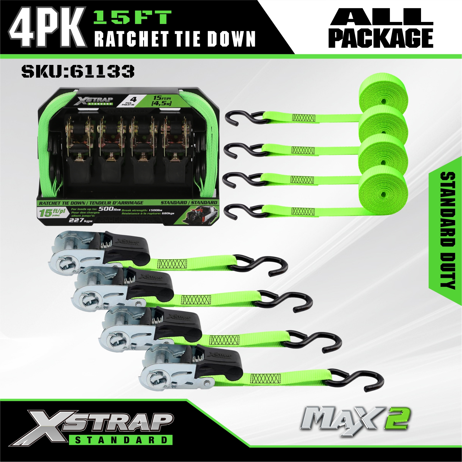 Xstrap 4 pacotes de amarração de catraca, alça de amarração de poliéster de 1" x 15', alça de catraca, capacidade de 500 libras, tiras de fixação de amarração de carga com ganchos S para caminhonete, SUV, motocicleta, barco de pesca leve, jet ski, moto de neve, trator de gramado.