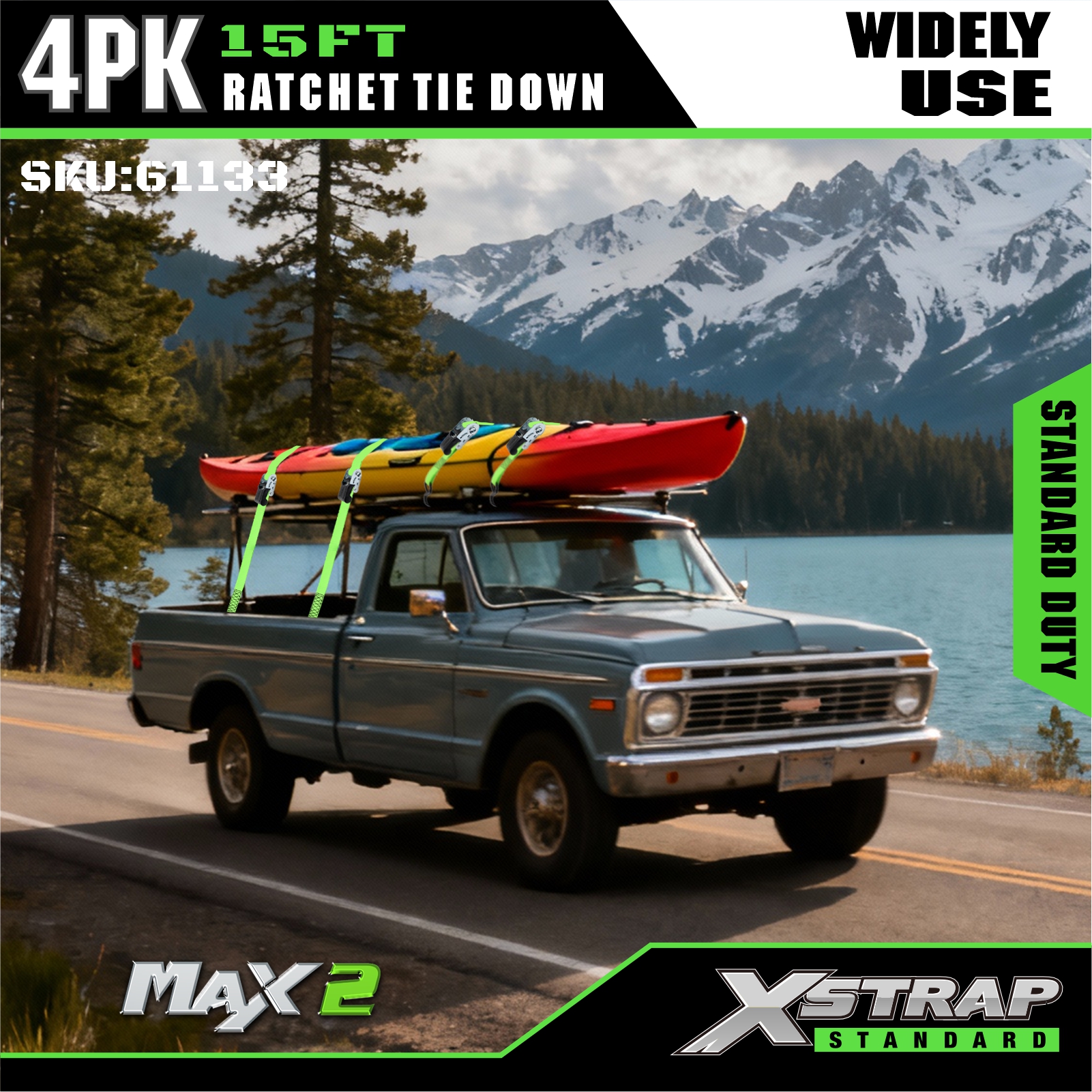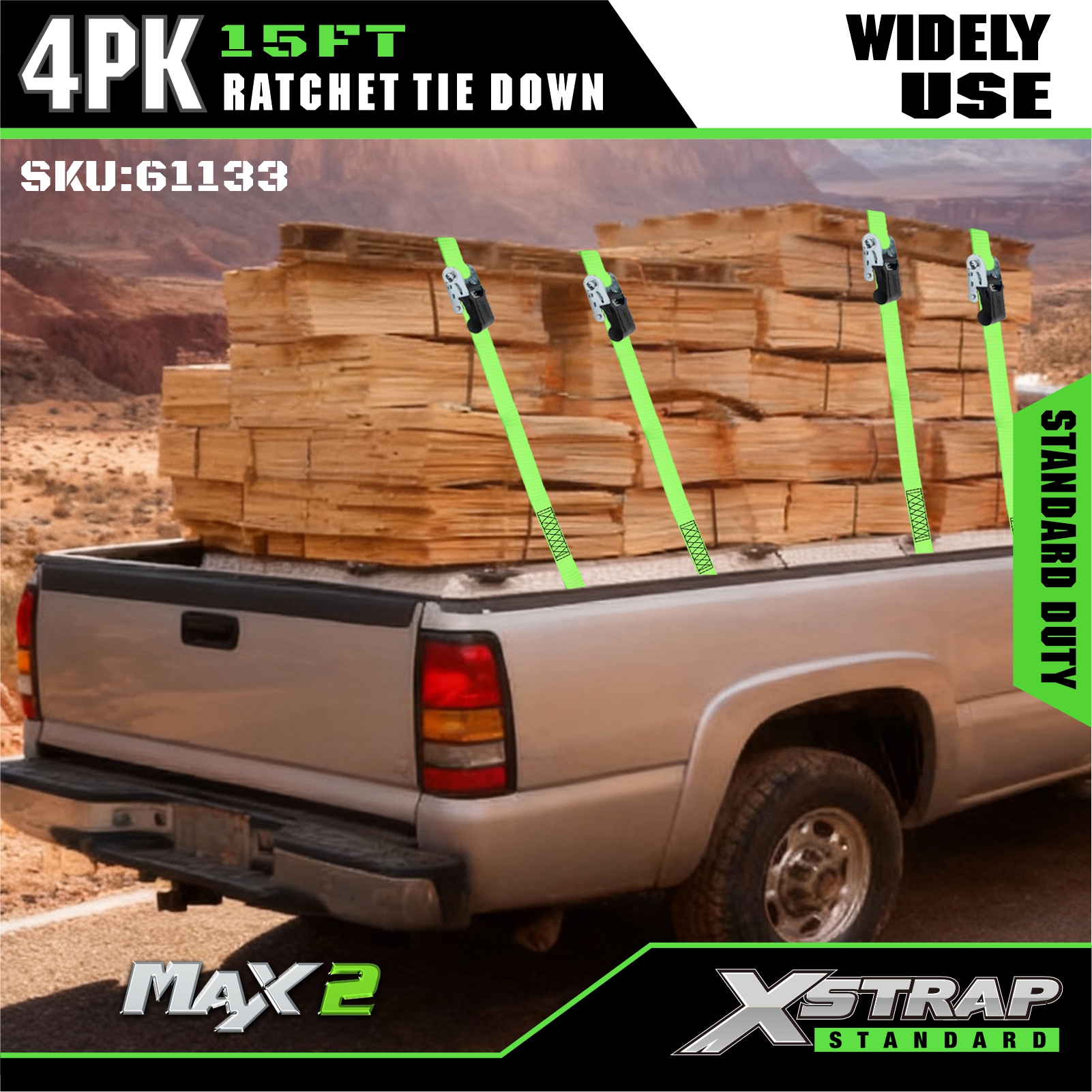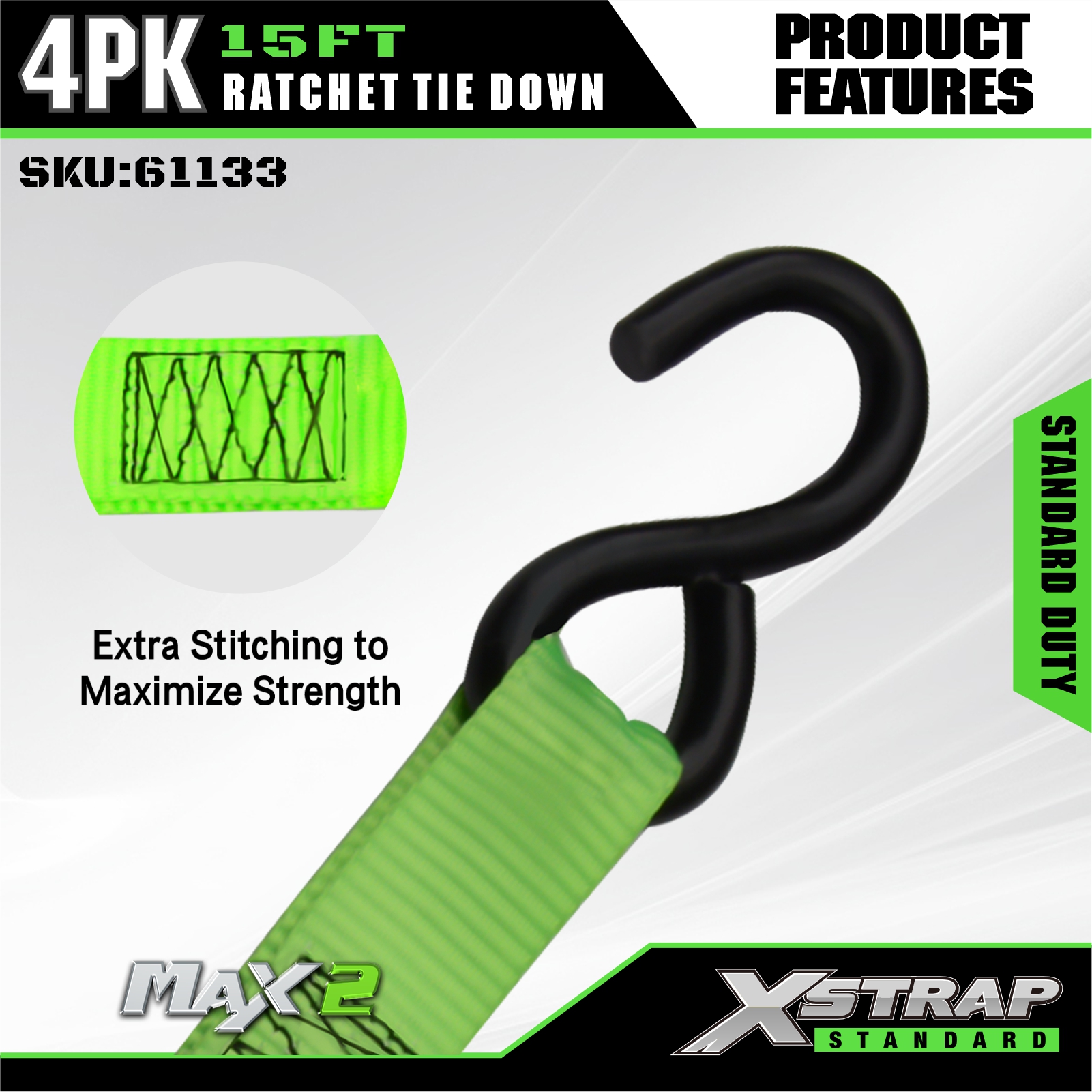Xstrap 4 pacotes de amarração de catraca, alça de amarração de poliéster de 1" x 15', alça de catraca, capacidade de 500 libras, tiras de fixação de amarração de carga com ganchos S para caminhonete, SUV, motocicleta, barco de pesca leve, jet ski, moto de neve, trator de gramado.