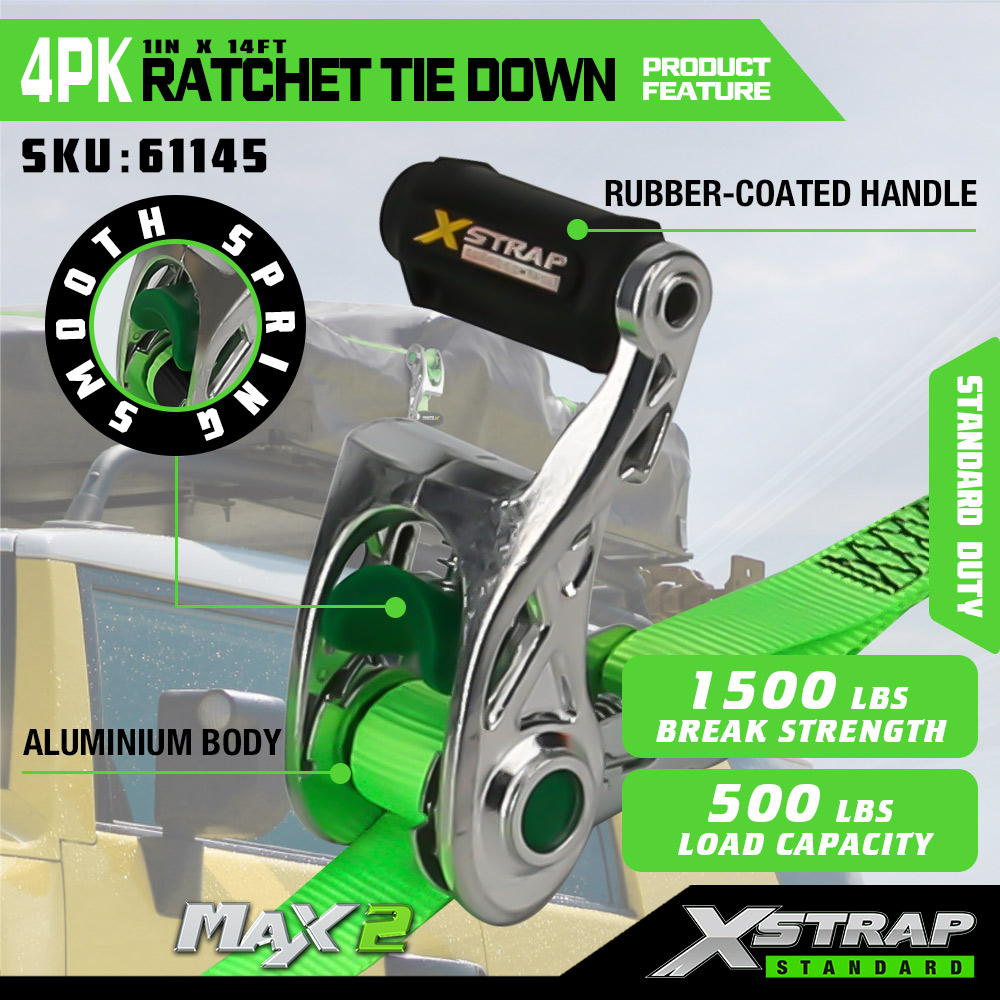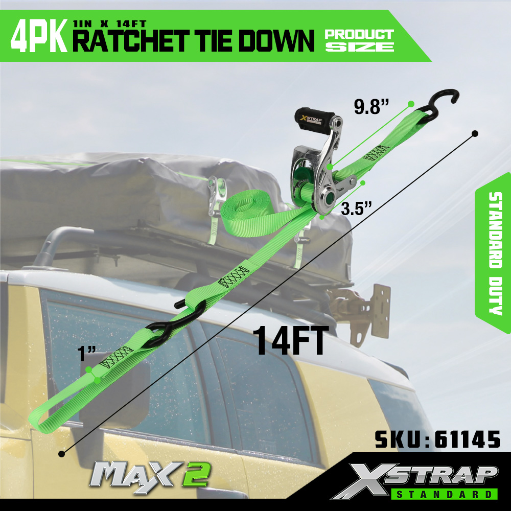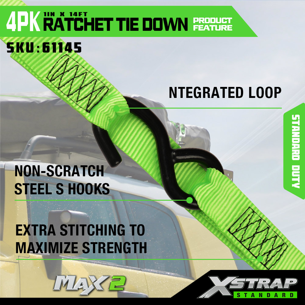 Xstrap 4 Pack Ratchet Tie Down com Soft Loop, 1" x 14' Poliéster Tie Down Strap Pull Ratchet Strap, 1000lbs Capacidade de amarração de carga Correias de fixação com ganchos S para caminhão, SUV, Racks superiores de carro para motocicleta.