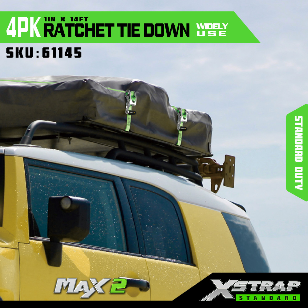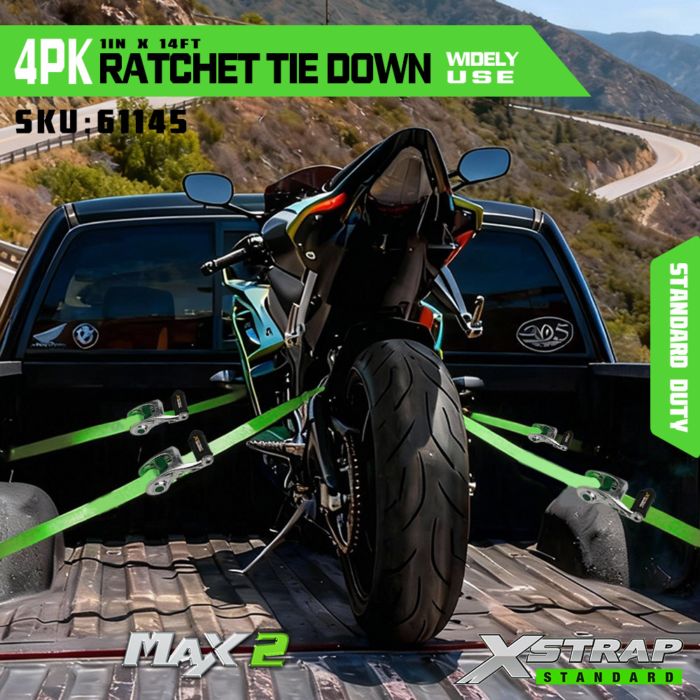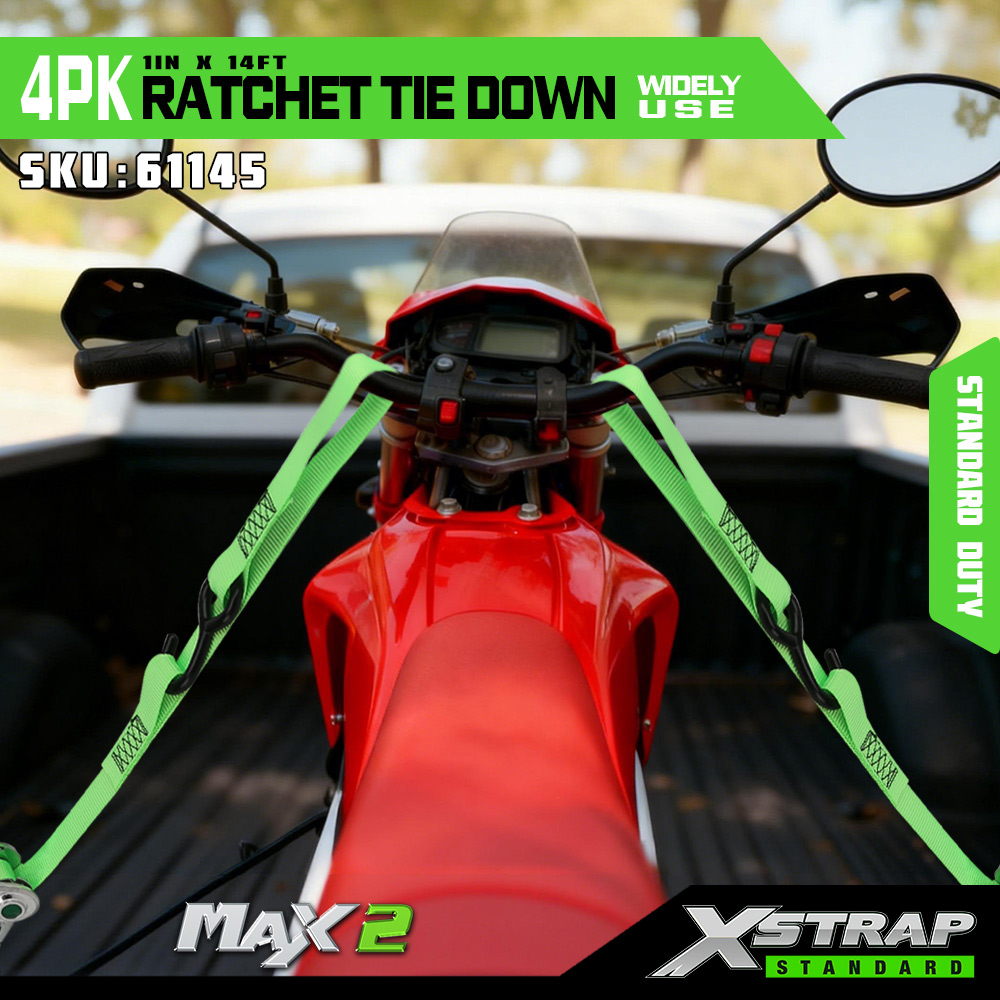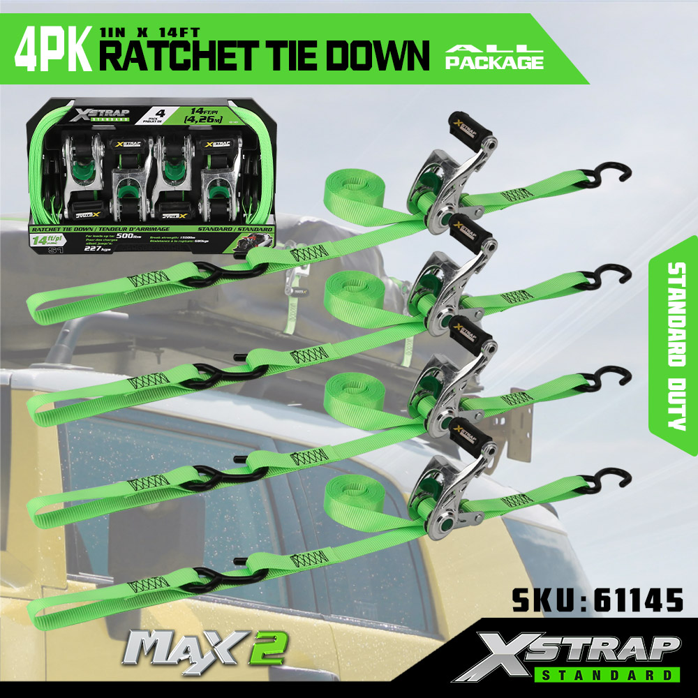 Xstrap 4 Pack Ratchet Tie Down com Soft Loop, 1" x 14' Poliéster Tie Down Strap Pull Ratchet Strap, 1000lbs Capacidade de amarração de carga Correias de fixação com ganchos S para caminhão, SUV, Racks superiores de carro para motocicleta.