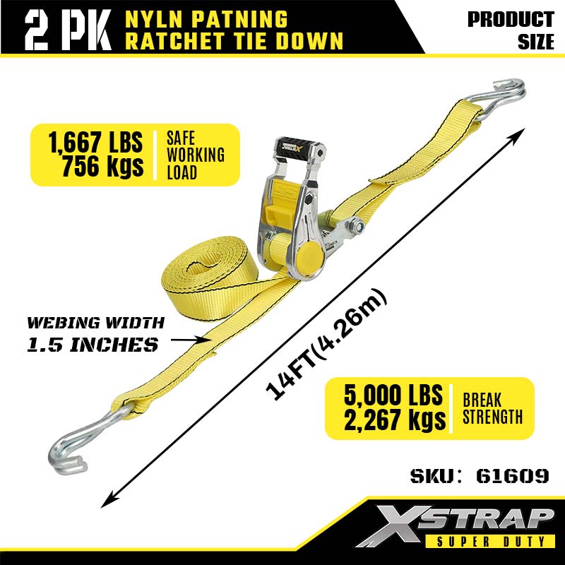 - Tamanho de 2 pacotes de 14 pés: largura de 1,5 polegadas espalha a tensão uniformemente para evitar danos. O comprimento de 14 pés cabe em reboques de caminhões ou racks de teto. O pacote de 2 oferece alças suficientes para proteger equipamentos grandes ou irregulares.