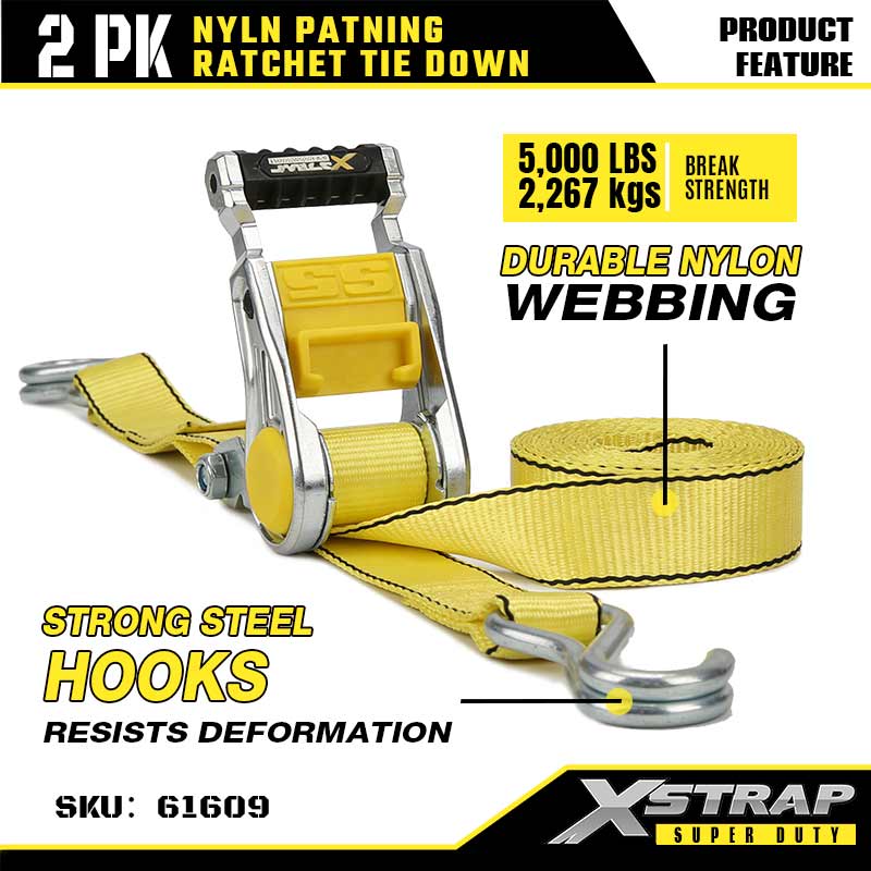 Amarração de catraca Xstrap 2PK com ganchos J duplos, cinta de amarração de poliéster de 2" x 3,6', cintas de fixação de amarração de carga com capacidade de 1.667 libras com ganchos J duplos para trailer de serviço pesado, barco de esqui para trailer de cama plana, carro pequeno, equipamento pesado.