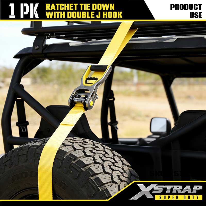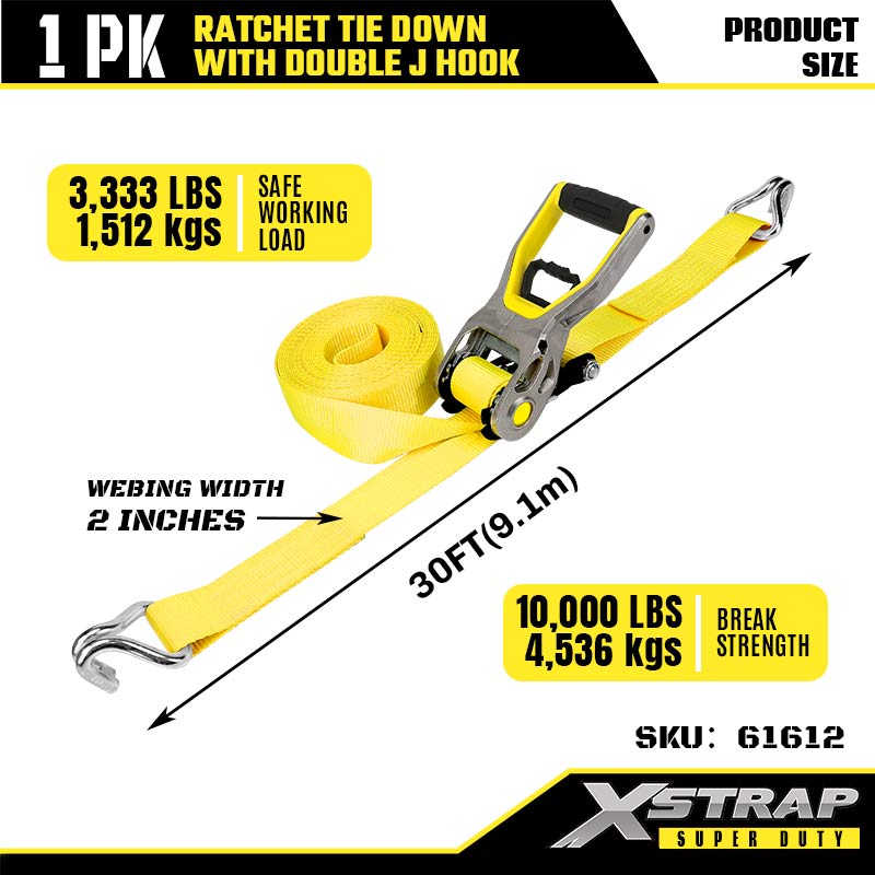 Amarração de catraca Xstrap 2PK com ganchos J duplos, alça de catraca de poliéster de 2" x 30', cintas de fixação de amarração de carga com capacidade de 3.333 libras com ganchos J duplos para trailer de serviço pesado, barco de esqui para trailer de cama plana, carro pequeno, equipamento pesado.