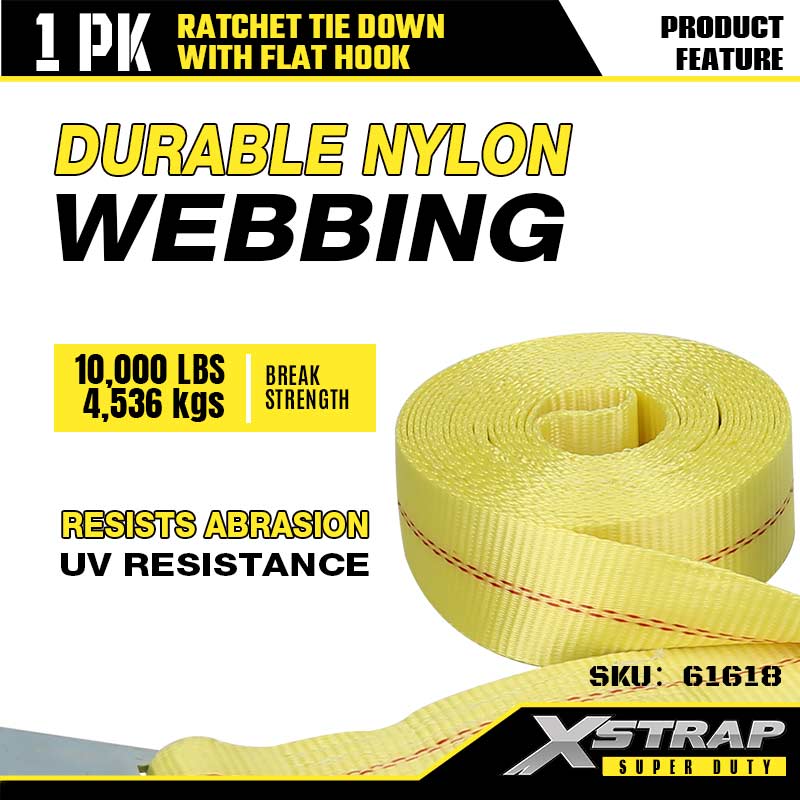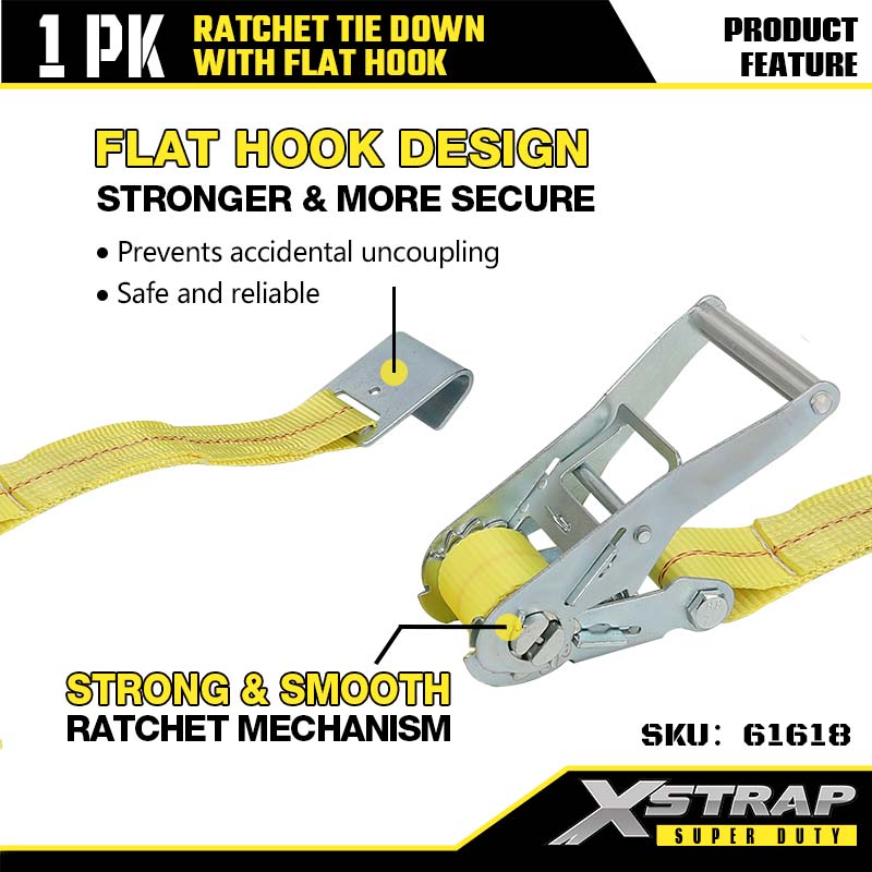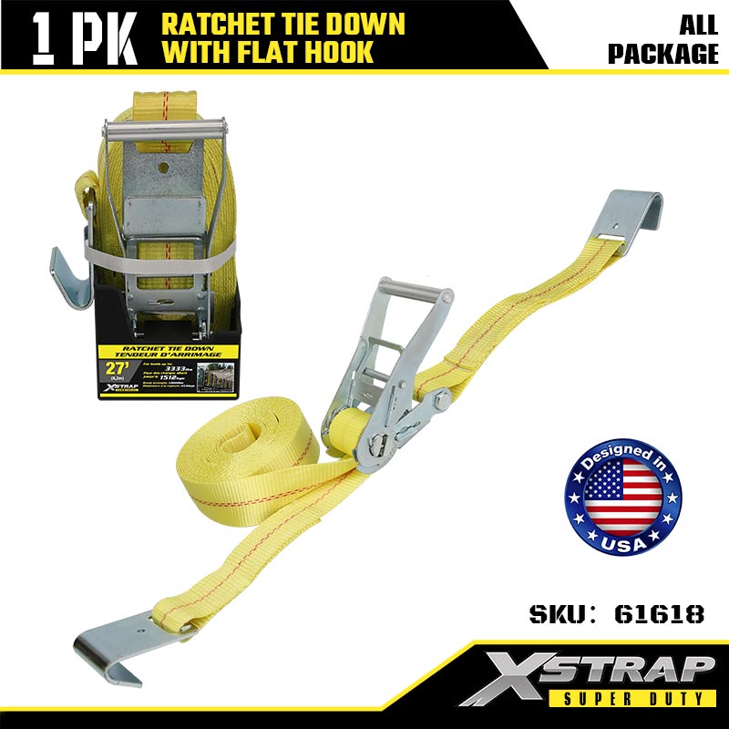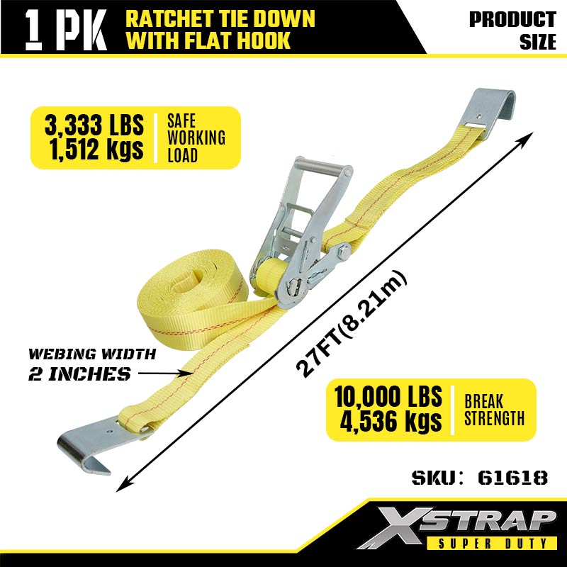 Amarração de catraca Xstrap com ganchos planos, cinta de amarração de poliéster de 2" x 27', cinta de amarração de carga com capacidade de 3.333 libras com ganchos planos para reboque de serviço pesado, barco de esqui para reboque de cama plana, carro pequeno, equipamento pesado.